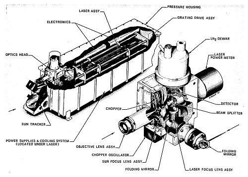The command and data system operated via PCM telemetry. Commands adjusted the laser grating angle, piezo tuning voltage, and receiver oscillator frequency. Sun and laser blockers allowed baseline and noise checks. Ground handling was performed with NCAR's telemetry equipment. Cooling was maintained by circulating fluid through the laser and electronics to an external radiator with resistive heaters.