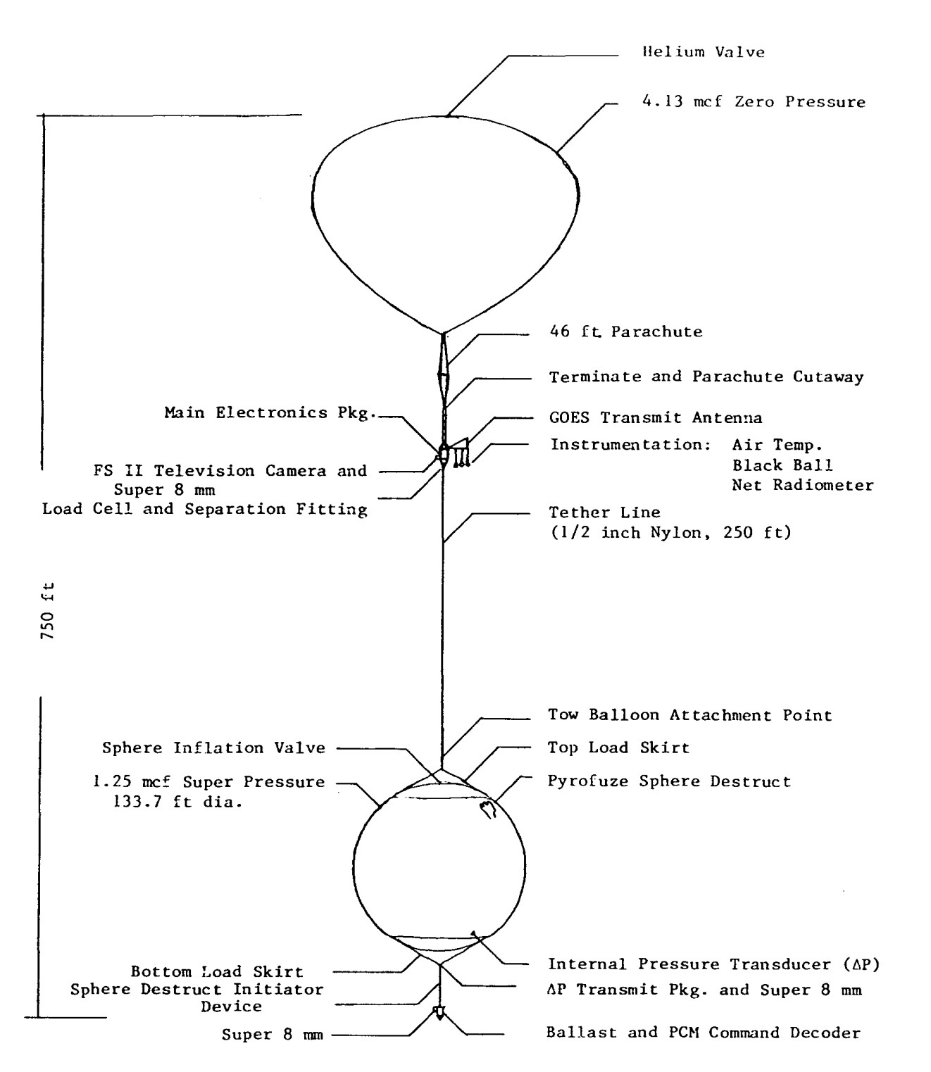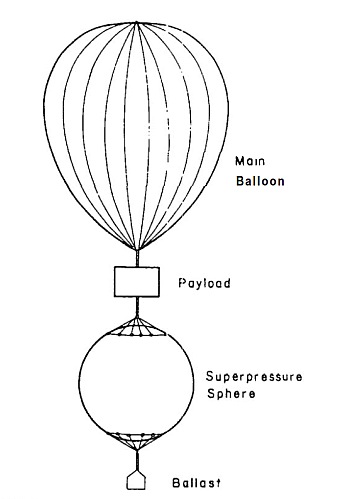 The theoretical operation of the system was as follows. Once the system was airborne, on the way to the main balloon's operational altitude, the super pressure became filled and pressurized. As the "super pressure" continued to be carried upward it losed more and more lift. When sunset occured the entire system descended to a new equilibrium altitude where the increase in lift on the super pressure balloon just equaled the sunset effect on the main balloon. Although its volume was decreased, no gas was lost from the main balloon. At sunrise, the main balloon expanded and the system once again rose. In so doing the super pressure balloon losed the lift that it gained at sunset and the system stabilized at the same altitude as the preceding day. Since there was no change in suspended weight on the main balloon, it should not overshoot and again there will be no loss of gas. As in the pure super pressure system, assuming there were no leaks, the flight duration was limited only by creep, gas diffusion and ultraviolet degradation of the balloon fabric.