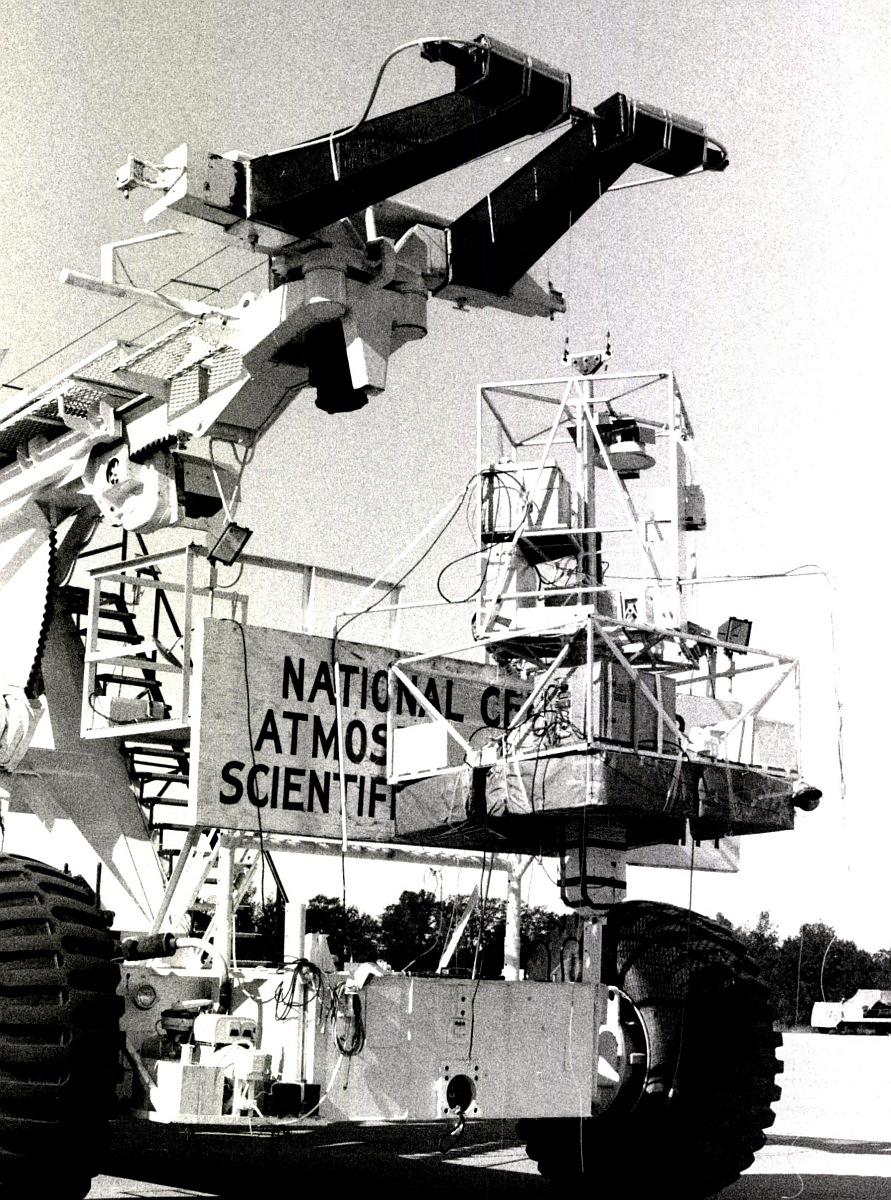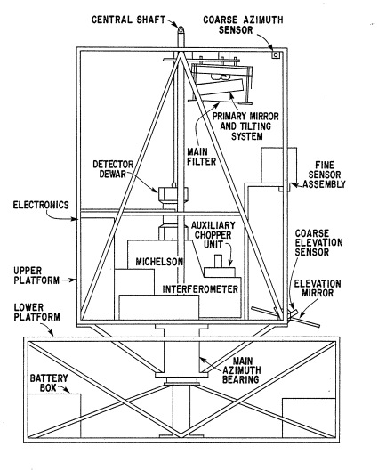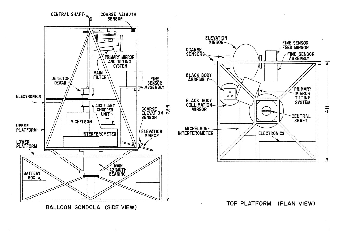 The payload is shown in a schematic diagram in the figure at left and in a photograph at right (click to enlarge). The scientific instrumentation was mounted on the upper platform which was free to rotate in the azimuthal direction defined by the central shaft. The bottom of this shaft was connected to the lower platform via the main azimuth bearing assembly containing the servo-controlled azimuth torque motor. Slip rings in this assembly linked the upper and lower platforms electrically and were used in redundant pairs as a precautionary measure to carry electrical power from the batteries to the instrumentation and electronics. The batteries (lead-acid) were placed in the corners of the lower platform to maximize the reaction torque of the system. The main frame was constructed from 25 mm square-section aluminum tubing with 3 mm walls and the complete gondola (including scientific instrumentation, telemetry equipment and ballast), in flight configuration, weighed approximately 580 kg. The elevation mirror, located at the front of the upper platform, was free to rotate about a horizontal axis and was driven by a servo-controlled torque motor to direct the solar beam up to the primary mirror. The radiation was focussed by this mirror and entered the Michelson interferometer.