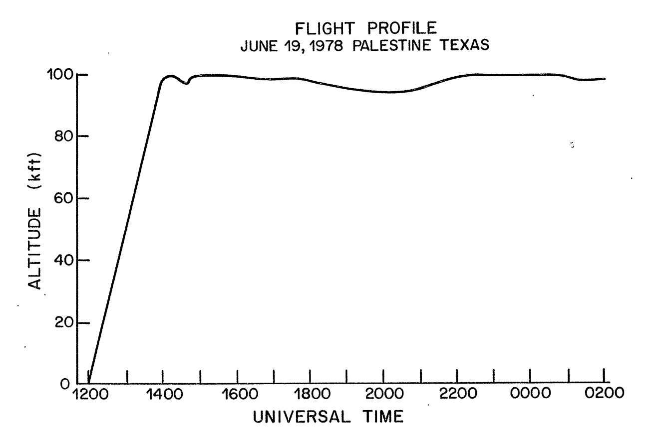 The University of Calgary balloon-borne solar telescope was launched from the National Scientific Balloon Facility base at Palestine, Texas on 19 June 1978 at 12:00 UTC. The ascent rate of the balloon and payload was close to 1,000 ft./minute and the combination reached the float altitude of 99,000 ft. at 14:00 UTC. The flight profile is shown in the figure above. The telescope pointing control was activated by command from the ground at 13:12 UTC at an altitude of 55,000 ft.