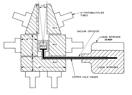 The figure at left shows a schematic diagram of the instrument (click to enlarge). The gamma-ray telescope was designed around the largest single Ge(Li) crystal commercially available: a cylinder about 6.3 cm in height and about 4.7 cm in diameter with an active volume of about 92 cm3. A 30 liter liquid-nitrogen Dewar was used to cool the detector to 85 degrees kelvin. The unit was modified for additional mechanical strength and was able to maintain the detector cooled for up to four days of flight. Surrounding the central detector assembly were 184 kg of active Nal in three sections. These shield crystals were operated in anticoincidence with the Ge(Li) detector and served to ensure that only full-energy events in the Ge(Li) were analyzed, while also acted as a collimator defining the field of view of the telescope and finally shielded the detector from the large atmospheric gamma-ray background. All the Ge(Li) pulses that were not vetoed by the shielding system passed through a preamplifier and a shaping amplifier, were analyzed by an analog-to-digital converter and stored in a memory module specifically designed.