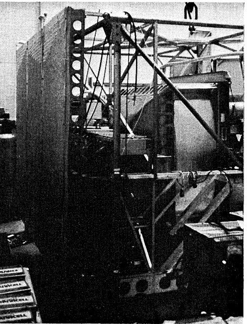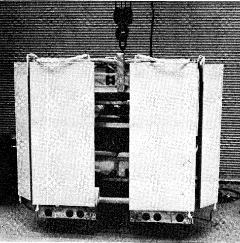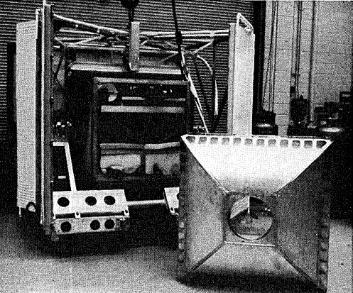 Frontal view of the gondola showing the overall cubic structure. The front radiator panels are prominant, with the viewings lot for the telescope. The pressure domes have been left off the package, permitting viewing of the interior of the experiment View from the right rear quarter showing the rear radiator panel, the battery and telemetry shelf, and part of the rear pressure dome. Radiator panels have been pulled back to yield a better view of the interior. The front pressure dome is shown in the foreground.