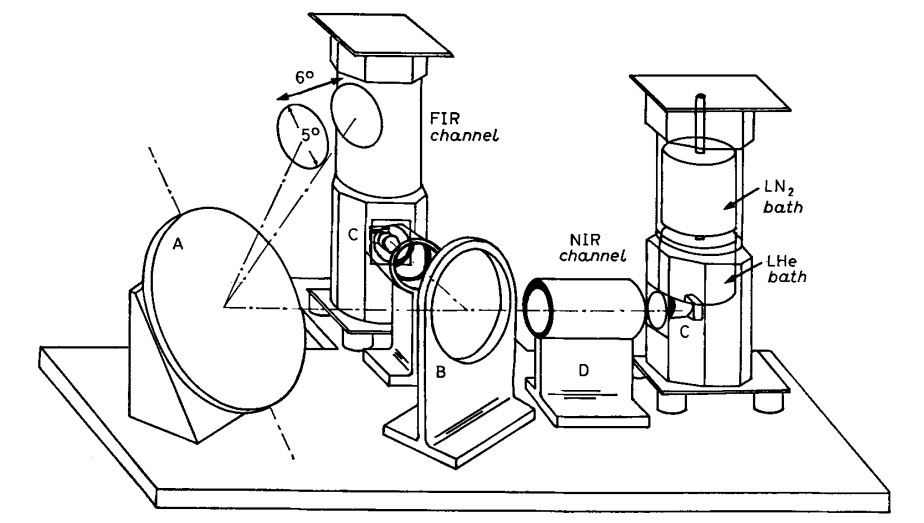 The high-frequency channel (NIR) was matched to dust emission, being centred at 150 µm; the low-frequency channel (FIR) was sensitive at wavelengths greater than 350 µm. In this way the experiment was sensitive to both dust and CBR emission. All these elements were shielded using Eccosorb panels and housed in a rectangular gondola as we can see in the images at right.