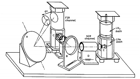 The objective of the flight was to perform a survey of far infra-red galactic dust emission in the wave-length region of (150~400) and (350~3000) micrometers, at angular scales larger than six degrees. The instrument on board was a balloon-borne two-channel differential photometer denominated ULISSE. At left we can see an scheme of the optical lay-out of the instrument (click to enlarge) where A was the 25 cm diameter wobbling mirror which performed a 6 degrees spatial modulation in a direction parallel to the horizon in order to avoid atmospheric offset. B is the metallic mesh arrangement of 180 lines per inch used to split the beam and to focus on the detectors by two TPX lenses, which defined a field of view 5 degrees wide (HPBW). C are the liquid-helium dewars containing the detectors which were composite bolometers cooled to 1.6 K with their Winston cones. Finally D are the antidiffraction ensembles containing the TPX lenses.