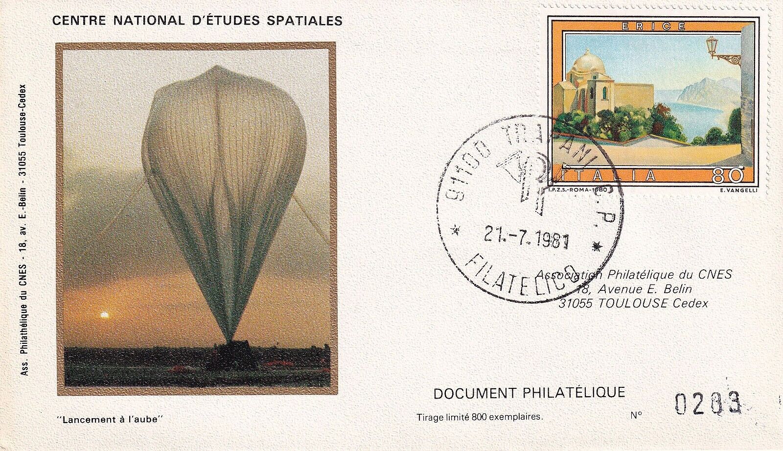 The balloon was released from the Milo base, Sicily, Italy in a Trans-Mediterranean flight on July 21, 1981 at 5:21 UTC and reached a ceiling altitude of 2.4 mbs at 8.30 UTC. The float level was maintained for a total duration of 13 hours until cut down over Spain at 21.30 UTC. The scientific and navigation data transmitted from the onboard telemetry system were continuously recorded by means of three different tracking stations in Milo (Launch base), Palma de Mallorca and Huelva (Spain).