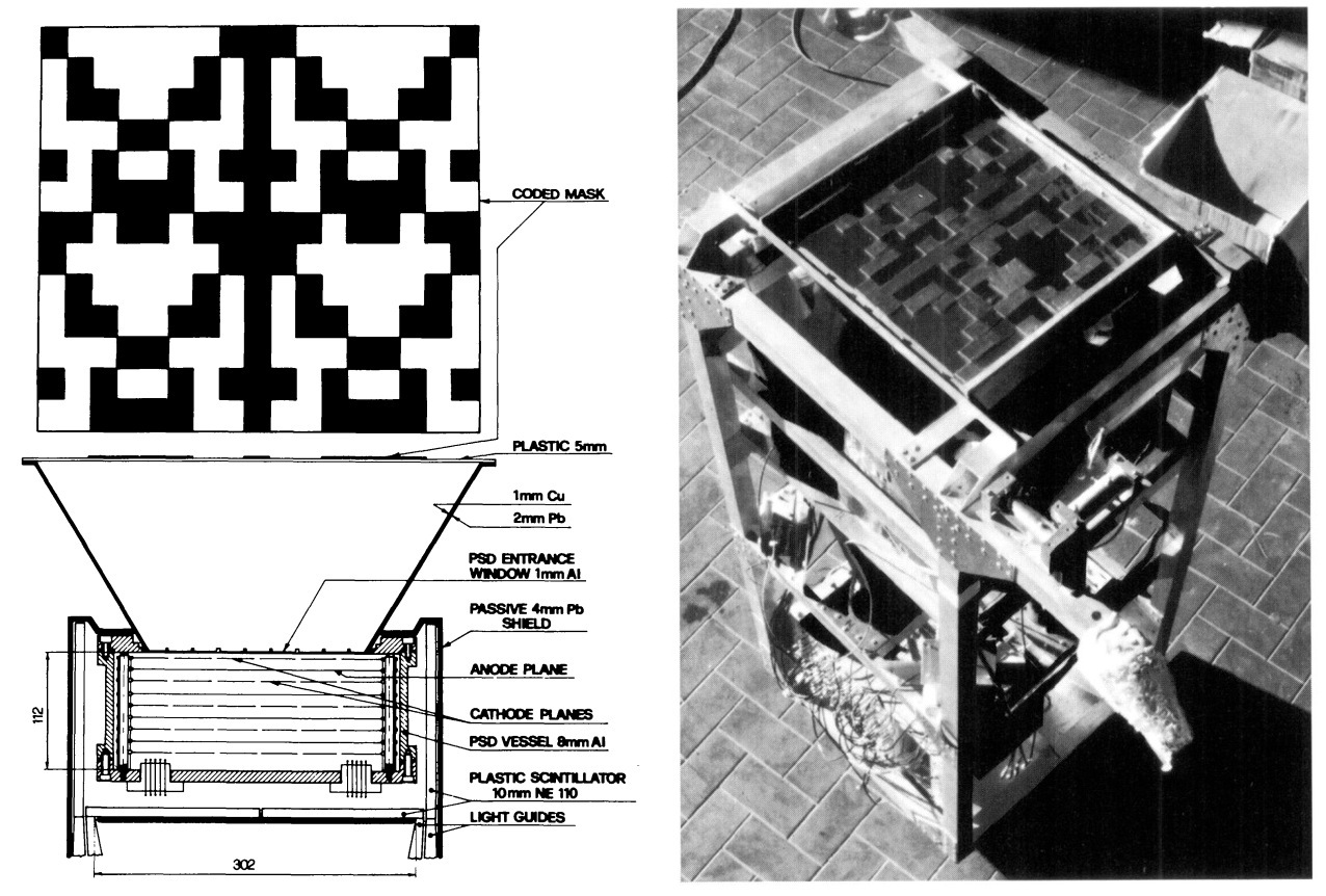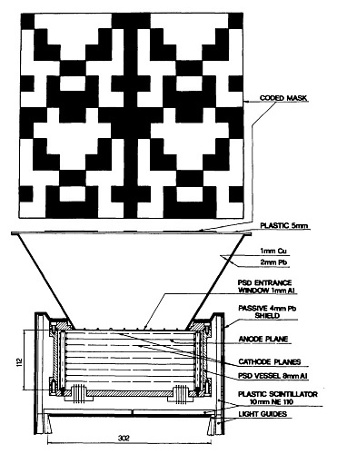 The TXC telescope consisted of a coded mask and a Xenon filled position sensitive multiwire proportional chamber. The figure at left shows a drawing of the TXC telescope and the pattern of the mask used (click for more details). The basic array of the mask pattern, based on Cyclic Difference Sets of Hadamard type consisted of NxM =7X9 opaque and transparent elements and had an area equal to the position sensitive detectors (PSD) entrance window area. The whole mask pattern was obtained repeating the basic array twice minus one line and one column, so that the overall mask area was about 4 times the detector area. The mask consisted of 97,2 mm thick, Pb pieces glued on a 5 mm thick plastic support and held at 240 mm over the PSD window. The elements were rectangles with dimensions 28 x 22 mm, about twice the PSD spatial resolution (FWHM).