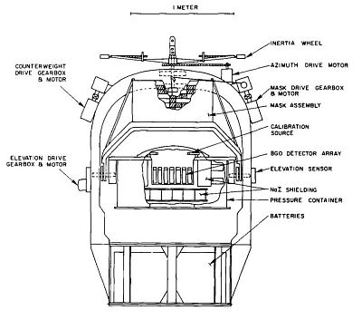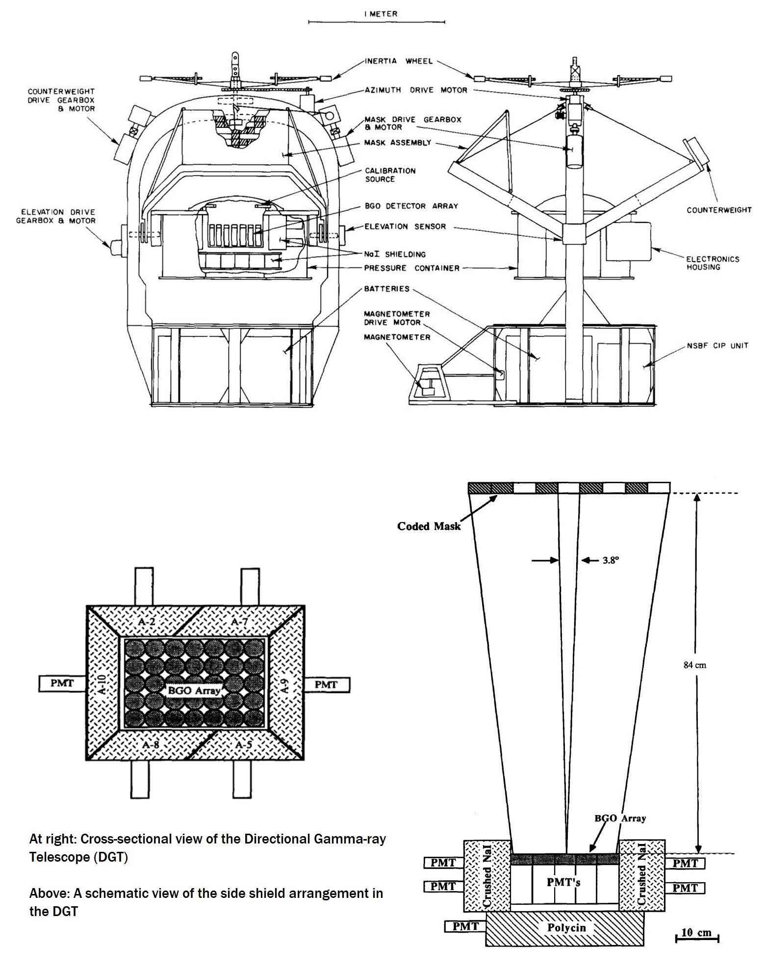 The DGT instrument is shown schematically at left (click to enlarge). The detection plane consisted of a 35-element array of bismuth germanate (BGO) scintillation crystals actively shielded from below by 10 cm of Nal Polysem and on the sides by 7.5 cm of Nal. The entire anticoincidence well defined a forward geometric aperture of ~120° FWHM. Each BGO element was a right-circular cylinder 5.1 cm in diameter by 2 cm thick. BGO was chosen in preference to Nal for the detection plane because of its higher sensitivity per unit volume. The coded mask of the DGT was positioned 84 cm above the detection plane and had outside dimensions 72.8 cm by 50.4 cm. Each opaque element of the mask was composed of a 5.6 cm by 5.6 cm block of lead, of thickness 1.9 cm. Such a thickness was sufficient to attenuate 97% of the photon flux at 0.5 MeV and 60% at 2.6 MeV. The pattern of mask elements was based on a 5x7 URA pattern.