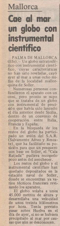 The balloon was launched flawlessly from the Trapani-Milo base in Sicily on August 2, 1982. After starting a nominal westward path towards Spain (as usual for transmediterranean flights) apparently a problem developed in the telecommand system and as a result the payload never reached spanish soil. Instead, it fell in the Mediterranean sea west of the port of Sóller in Mallorca. Spanish navy assisted in the recovery of the instruments which were finally found by a local fishing vessel.
