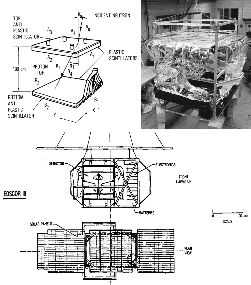 EOSCOR was composed by two scintillators separated by a 1 meter time-of-flight (TOF) path. Neutrons incident on the detector produced protons via scatterings and interactions in the upper scintillator. TOF is then used to discriminate the slower moving proton recoils from the copious relativistic Compton electrons generated by the atmospheric and cosmic gamma-radiation. Complete protection against data contamination by charged particle induced events is provided by veto counters placed above the upper scintillator and below the lower scintillator. The energy loss in the upper scintillator and the proton's velocity (as determined from the TOF measurement) were combined to give the energy of the proton recoil. Solar neutron events were then characterized by an increase in the neutron counting rate over the atmospheric background, correlated in time with a flare. Since the gondola orientation and the position of the sun were known, the incident neutron energy could be determined from the measured proton energy by simple scattering kinematics.