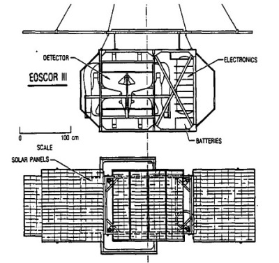 Power for the system was provided by silicad batteries, kept continuously charged during the day by an array of solar panels. The average power consumption of the detector and associated electronics was 80 Watts. As the EOSCOR detector was meant to operate during the day, no power was needed at night except to provide 3 Watts of "stay alive" power for the microcomputer program memory and occasionally to power internal heaters whenever the payload passed over a particularly cold cloud deck.