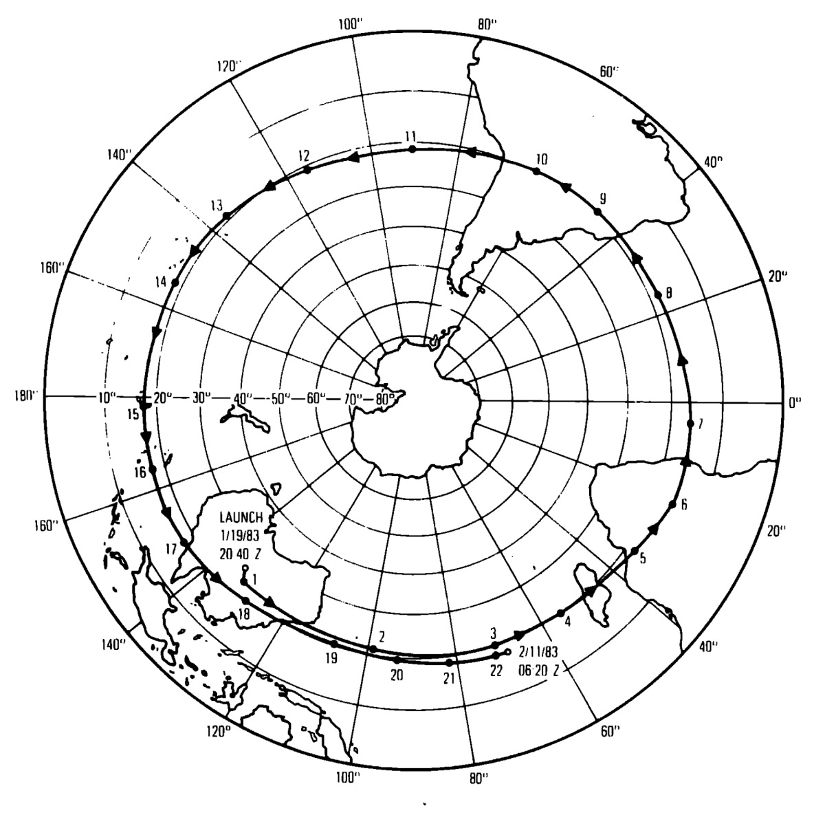 Processed data were telemetered to the ground through the METEOSAT and GOES satellites and the position of the balloon continuously monitored by the ARGOS satellites. The night altitudes remained nearly constant throughout the flight, except when passing over a very cold cloud deck near Tahiti. The day altitude, however, gradually decreased to about 34 km one day before termination. After circumnavigating the globe, an attempt was made to terminate the flight as it passed over Australia. The initial attempts to do so failed and termination was not achieved until it was out over the Indian Ocean were the mission was succesfully terminated on February 11 at 6:20 utc. Payload descended into the ocean and sunk.
