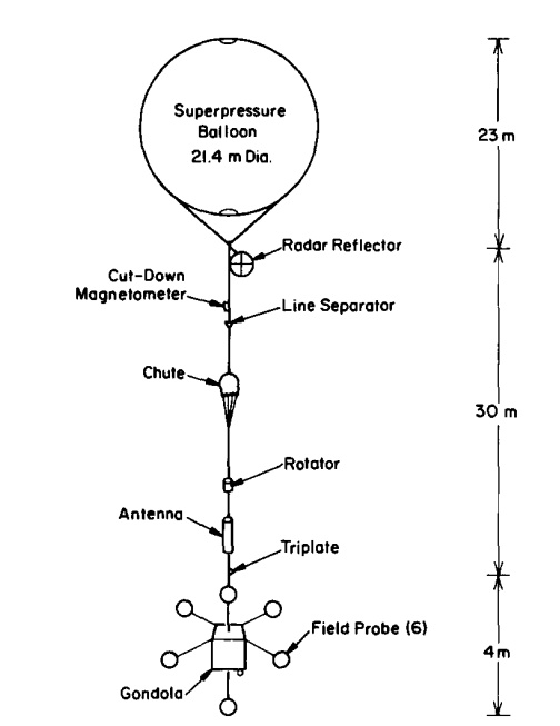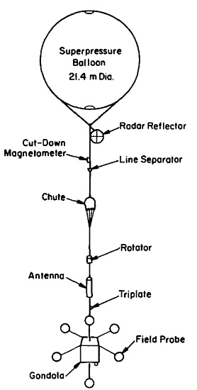 Each EMA flight used a 21.4-meter-diameter superpressure balloon carrying a flight train that included a radar reflector, parachute, line separator, cut-down magnetometer, rotator, antenna, field probes, and the gondola. A schematic of the flight train is shown in the image at left (click to enlarge).
