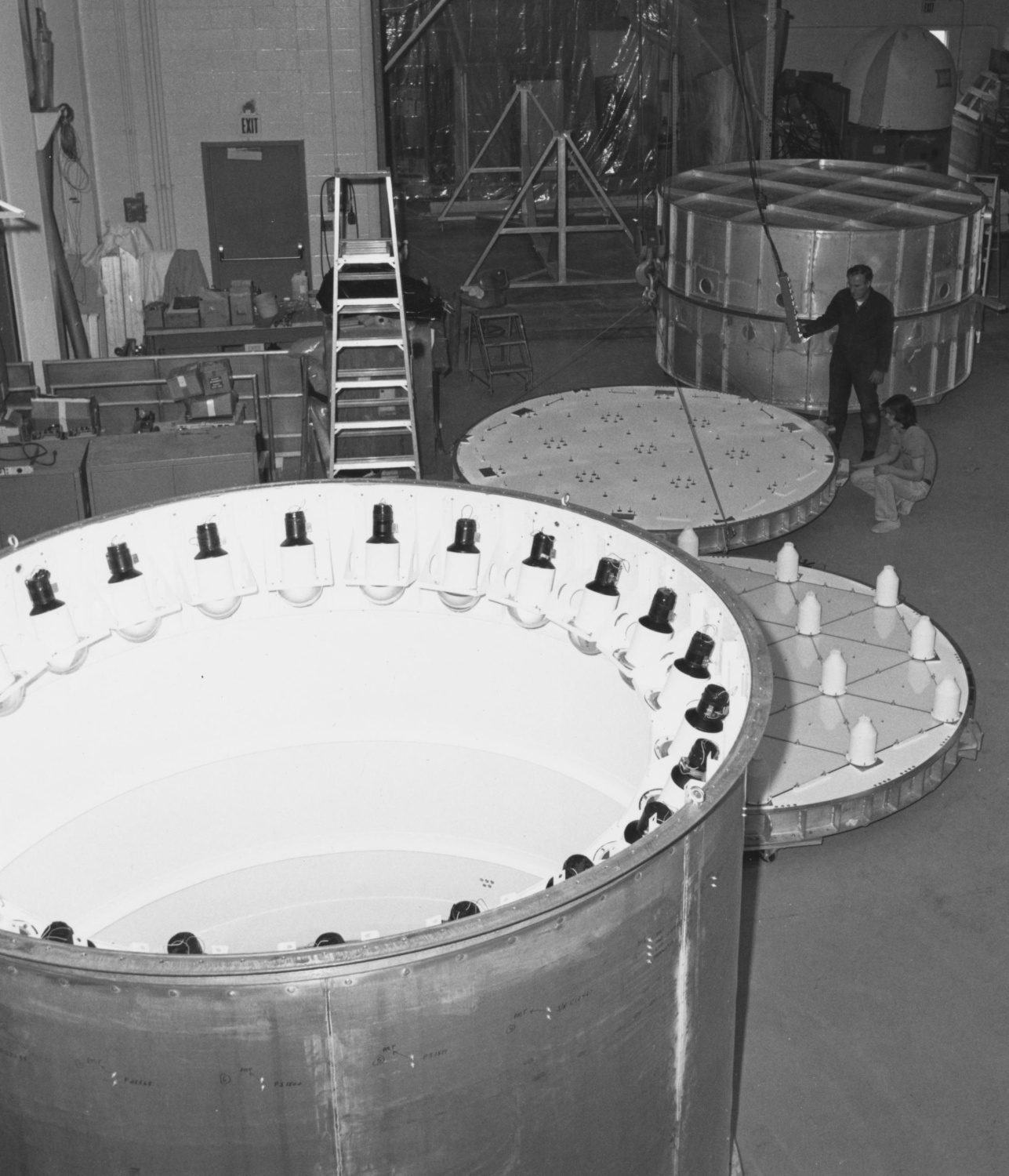 Cherenkov light within the central chamber was detected by 24 RCA 4522 photomultiplier tubes mounted near the upper circumference of the drum. Each 5-inch diameter PMT was fitted with an 8-inch hemispherical fisheye lens made of material with a refractive index of 1.43. These lenses improved light collection in the diffusion-box environment by a measured factor of 2.2. Overall, approximately 24 percent of all Cherenkov photons generated between 220 and 500 nm were collected by the phototube array, with about 70 percent of those photons having been wavelength-shifted.