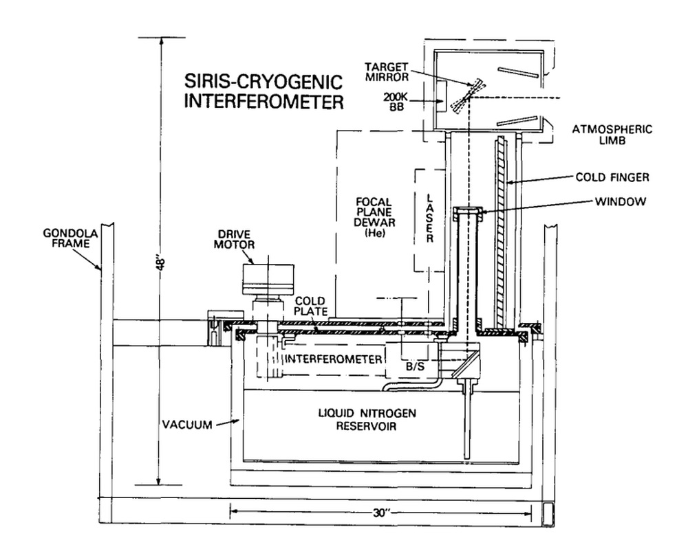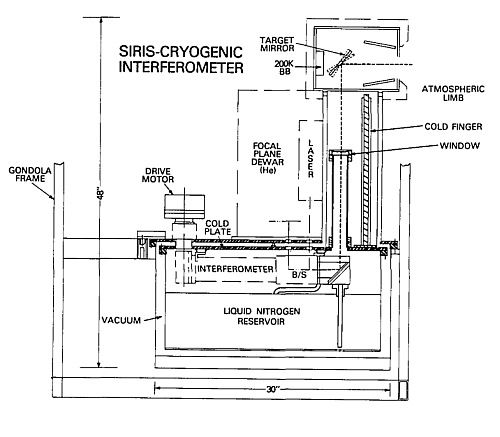 The interferometer output was directed to five Si:Ga photoconductor detectors inside a liquid Helium Dewar; one detector was for the wide band and the other four were for the narrow bands of the spectrum. The instrument was capable of operating from a balloon platform for periods up to 30 hours, thus allowing the concentrations of trace species to be monitored through a complete diurnal cycle. Use of the emission mode allowed observations at all times during the diurnal cycle and along a line of sight (LOS) of constant local time (either north or south). Remote sensing of the limb allowed vertical coverage from the middle troposphere to 40 km (the balloon altitude) with a vertical resolution of 3 km (1/2 scale height). Observations were taken at a series of tangent heights (the so-called limb sequence) and inverted to obtain gas concentration vs altitude.