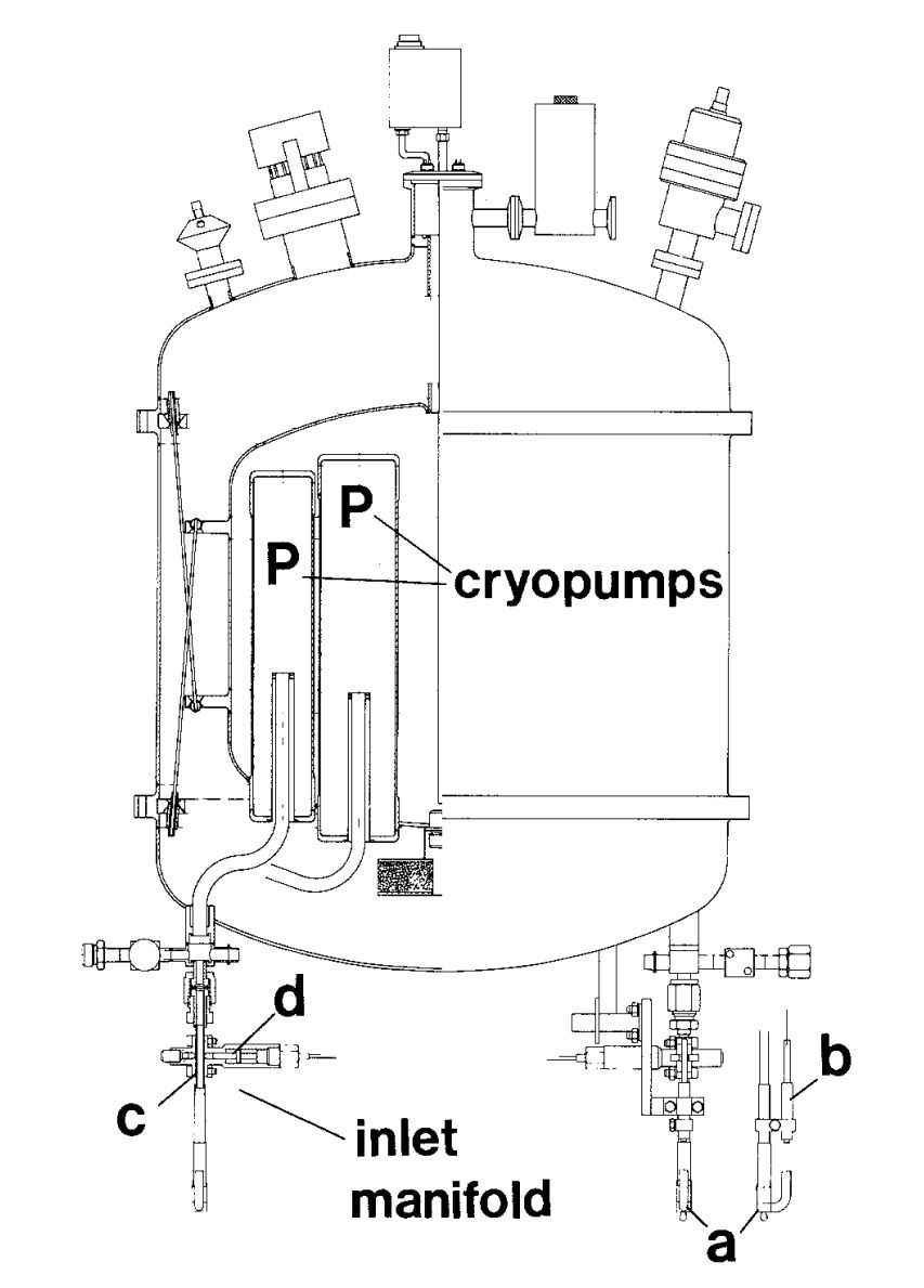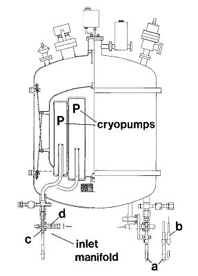 The sampler consisted of a dewar measuring 80 cm height and 60 cm of diameter in which 15 stainless steel containers were submerged in liquid neon and cooled to temperatures around 30º Kelvin. Five containers had a volume of 580 cm3 while the remaining ten had a capacity of 380 cm3 allowing a maximum collecting volume on each flight of 10 liters at standard temperature and pressure. Each container has its own cryopump, manifold and a device that was activated by telecommand during the course of the balloon flight where distinct samples were to be collected. A schematic view of the instrument is given in the figure at left. The cross-section (left part) shows the arrangement of the cryopumps (P) and the inlet manifolds located at the bottom; (a) breakable glass inlet (it maintains closed the inlets until reaching operative altitude), (b) spring loaded piston which break the glass sealing upon command from the ground; (c) gold tube and (d) squib fired closing device that sealed again the inlet after the sampling procedure was concluded. The sample containers inlets were located at the bottom of the cryosampler to allow the samples to be collected while the balloon was descending at a slow rate of 1 m/sec to 4 m/sec. Because the inlets were continously ventilated with clean ambient air during the descent, the risk of external contamination from the gondola or the balloon itself was strongly reduced.