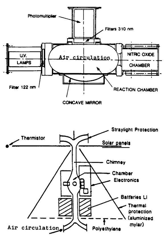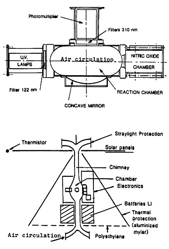 At left we can see an scheme of the instrument itself (up) and a diagram of the flight gondola (down). The working principle consisted in observing the fluorescence of the hydroxyl radical OH produced by photodissociation of stratospheric water-vapor by UV radiation. The ultra violet source was an hydrogen lamp manufactured at the SA laboratory, coupled with a Lyman a filter at 122 nm. For redundancy two lamps were used alternatively, which signals were monitored by a nitric oxide ionisation counter (NO counter) mounted in front of the lamps. Fluorescence measurements were made by a photomultiplier working in photon counting mode coupled with two filters centered at 310 nm. Its axis was perpendicular to the UV beam. Due to weight limitations, no turbine to renew the air, and no stainless steel sealed chamber pumped before the flight could be used. To reduce the outgasing contribution, the instrument was placed 200 m below the balloon and 100 m below the service gondola. A flow was insured inside the reaction chamber by the use of an aluminium chimney simply heated by collecting the upwelling infrared radiation from the earth with a thermal cover designed as the MIR itself. Straylight protections were mounted at the two exits of the chimney. The calculated air speed inside the chamber was 50 cm/sec during the night and 150 cm/sec during the day.