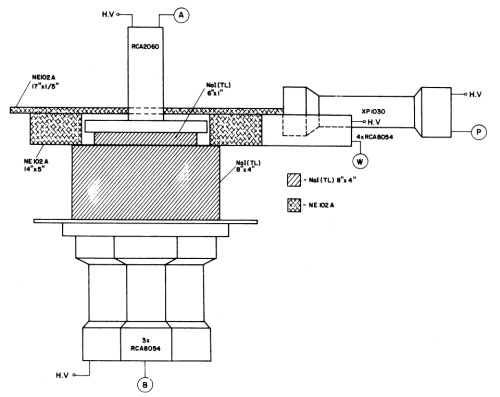 Surrounding the main detector was an anticoincidence shielding system designed to reject background radiation. Directly beneath the primary crystal was an 8-inch by 4-inch (20.32 × 10.16 cm) NaI(Tl) crystal serving as a bottom shield against upward-moving gamma rays and secondary particles. A 14-inch diameter by 5-inch tall (35.56 × 12.7 cm) annular plastic scintillator made of NE102 surrounded the sides of the detector assembly, providing charged particle rejection through coincidence vetoing. The top of the detector stack incorporated a 5 mm thick plastic scintillator panel to tag and reject incoming charged particles before they could reach the sensitive volume.