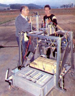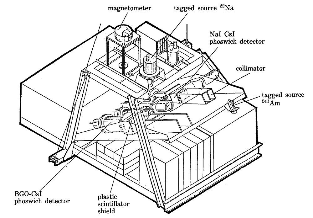 A general view of the whole payload is shown at left. The gamma-ray detectors are BGO-CsI (T1) phoswich modules. Each is mounted within a pressurized can of aluminum, also including the photomultiplier (PMT), voltage divider, power supply and preamplifier; detectors 2 and 3 are directly coupled to the bi-alkali PMT window, while detector 1 is optically coupled through a quartz window (10 mm). The X-ray detector no. 4 is a classic NaI(T1)/CsI(Na) phoswich combination. It is mounted with external PMT, through a lead glass window, and a potted voltage divider.