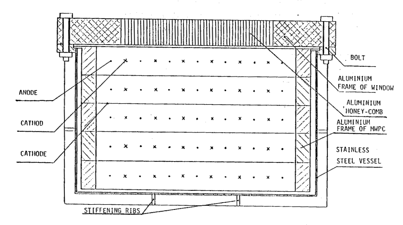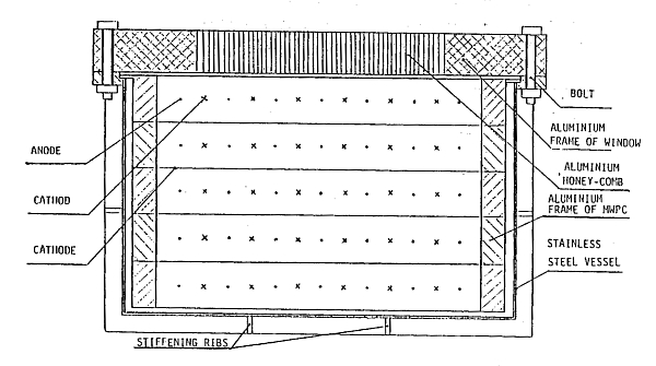 Internally, the chamber was divided into five 30 mm thick detection layers using six cathode planes made of 100-micron gold-coated tungsten wires arranged 2 mm apart and tensioned to 100 grams. Between each pair of cathode planes were seven anode wires, also gold-coated tungsten but thinner at 20 microns and tensioned to 55 grams. These were fixed using crushed copper tubes and were separated by additional cathode wires, effectively dividing each layer into seven independent detection cells, each measuring 30 mm × 30 mm × 350 mm. The unit was rigidly mounted inside the vessel, and a combination of 2 mm tin and 1 mm lead shielding was applied to all sides and the bottom to reduce background radiation.