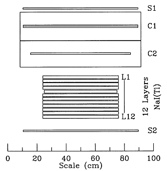 HEIST (which can be seen schematically in the drawing at left) employed a sophisticated set of detector components. It contained a stack of 12 NaI(Tl) scintillators, each 2 cm thick and 52 cm in diameter, to measure the total energy of stopping nuclei. The instrument determined particle trajectories by analyzing the distribution of scintillation light across six photomultiplier tubes assigned to each NaI(Tl) layer, achieving a positional accuracy of about 4 mm for the nuclei of interest. To measure the velocity of incoming nuclei, HEIST used two Cherenkov counters: C1, with a Teflon radiator corresponding to a threshold energy of 442 MeV/nucleon, and C2, with a Pilot-425 radiator providing a threshold of 305 MeV/nucleon. A plastic scintillator (S1) provided an event trigger and a charge identification measurement through energy loss detection, while a second scintillator (S2) identified penetrating events.