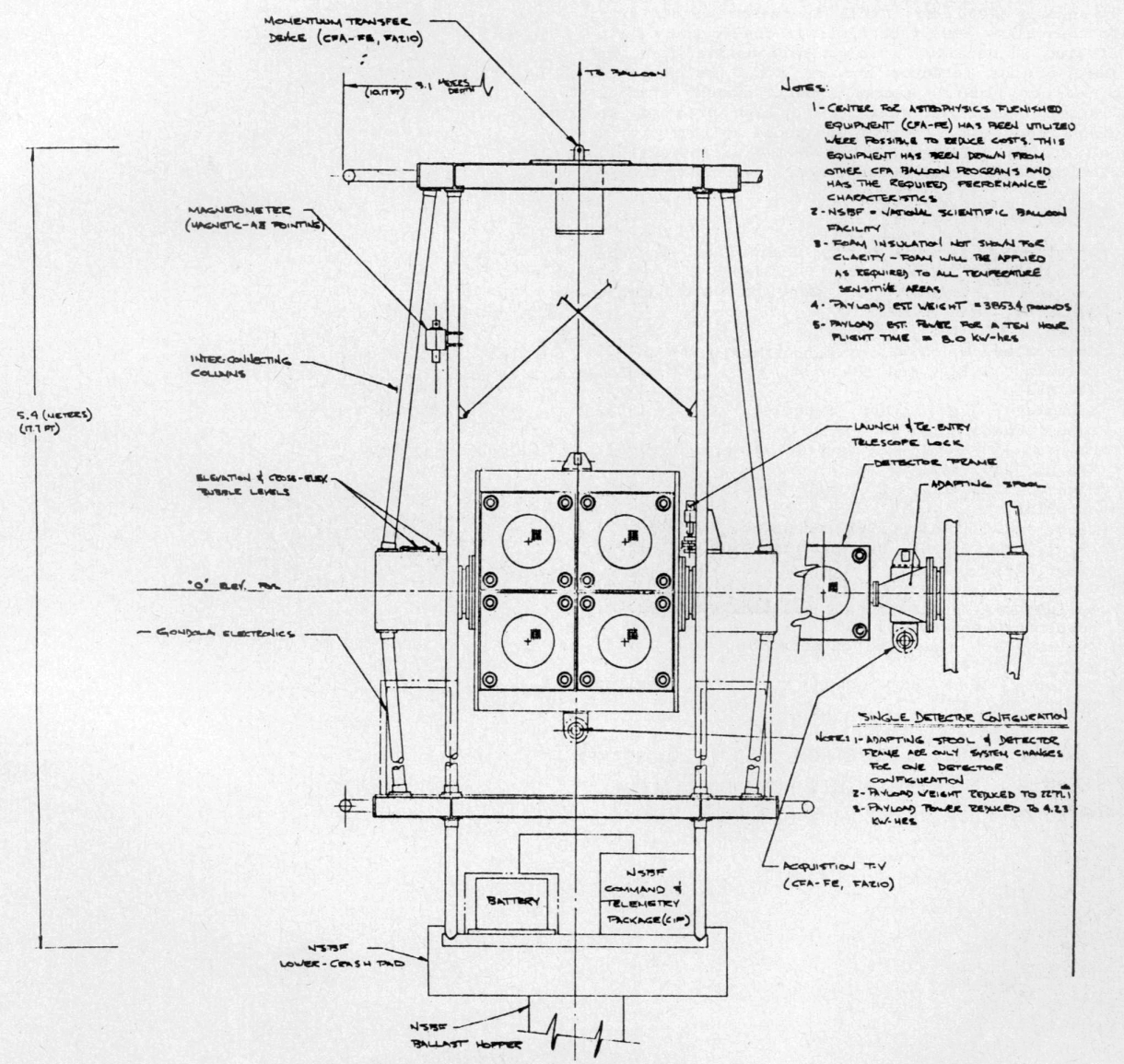 In the image at left we can see an scheme of the instrument and the gondola (click to enlarge). The primary detector was a NaI(Tl) scintillator, 34.5 cm in diameter and 6.4 mm thick, optically coupled to a Thomson CSF THX463 diode image intensifier tube with 17:1 electrostatic reduction optics and a fast phosphor output. A second image intensifier (THX1308) coupled to a silicon PIN-diode readout completed the imaging chain. This configuration provided spatial resolution of 310 mm over the energy range, enabling source imaging with an angular resolution of 22 arcminutes and positional accuracy of under 2 arcminutes. The scintillation crystal was sealed behind a 10 mil aluminum window, and x-rays had to pass through atmospheric, structural, and shielding materials before detection.