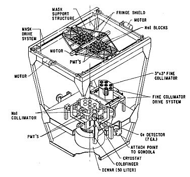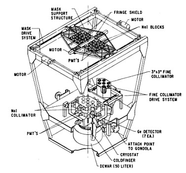 The instrument is mounted in a gondola offering a conventional azimuth-over-elevation pointing system with a momentum wheel for azimuth control. Coarse pointing control used the earth's magnetic field as a reference. A CID camera was used to image star fields and the sun to obtain an independent and more accurate measure of the absolute pointing direction.