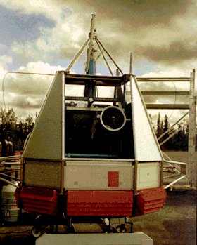 The platform base -see image at left- on which instruments and telescope were mounted was octagonal shaped. The entire gondola had a width of 3 meters and a height of 2.9 meters, weighting less than 500 kg. It's mechanical design was planned keeping in mind that it would be used repeated times in several flights so was developed to avoid damage to vital parts of the instruments at landing. Thus, the central telescope mount was located inside a lifting yoke which was in turn surrounded by an impact protection cage. Crush pads mounted below the gondola were also included in each flight to absorb the landing shock.