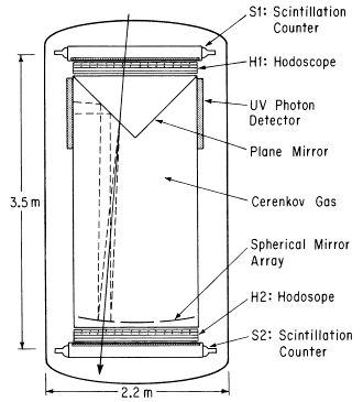 A schematic cross section of the instrument is shown at left. The main detector components are: (1) two scintillation counters, located at the top and bottom of the instrument, to provide a coincidence trigger and a measurement of the nuclear charge. (2) a hodoscope consisting of eight drift chambers (four Chambers above and below the Cherenkov counter, respectively) to determine the particle trajectory and to provide an additional charge measurement, and (3) a ring imaging Cerenkov counter to measure the Lorentz factor of the particle. An incident cosmic ray nuclei, passing down through the radiator volume produced a narrow cone of Cherenkov light centered around the trajectory of the particle. The light was reflected by the espherical mirror and focused in the image of a ring into one of the two photon detectors in the focal plane. The flat 45º mirrors served to move the focal plane and hence the photon detectors out of the trajectory of the incident particle. Since the range of sensitivity of the photon detectors was between 2200 and 1700 all the optics in the instrument worked in the vacuum UV region.