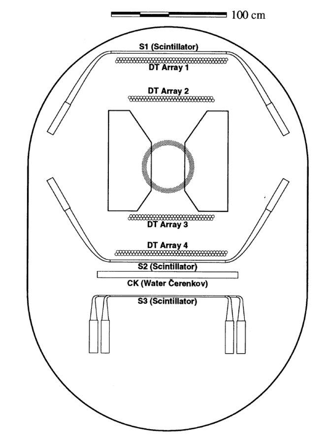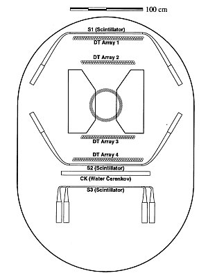 The time-of-flight (TOF) system consisted of two planes of plastic scintillator located 1.8 m apart, and formed each plane of several scintillator slabs 100 cm long by 25 cm wide by 1.9 cm thick. S1 was located above the upper drift tubes and included four such paddles, while S2 was located below the lower drift tubes and included three. The scintillation light was channeled through bent light pipes into photomultiplier tubes (PMTs), one at each end of each paddle. After passing several electronic filters and discriminators the signals are fed to TDCs where the time and pulse height were used to determine particle velocity and charge.