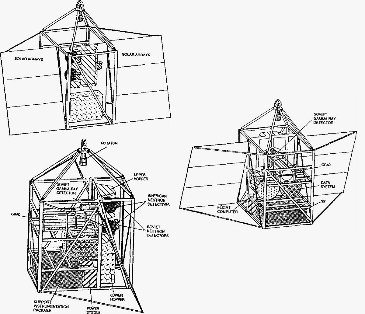 The Soviet neutron detectors were three Helium-3 (3He) gas proportional counters. The epithermal neutron detector was a 3He tube wrapped in cadmium and the thermal/epithermal neutron detector was a 3He counter covered by a thin sheet of tin. The flux of the thermal neutrons was determined from the difference in count rates recorded by these two detectors. The counter for detecting fast neutrons was surrounded by a polyethylene moderator. It was placed as far away as possible from the other neutron detectors so that neutrons moderated by the polyethylene will not effect them. As with the Soviet gamma-ray detector, the neutron detectors had self contained power supplies and thermal control subsystems.