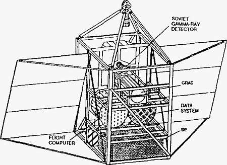 The Soviet gamma ray detector consisted of a thallium activated cesium iodide [Csl(TI)] scintillation crystal 10 cm in diameter by 10 cm long mated to a photomultiplier tube (PMT). It had an energy resolution of better than 12% at the 662 KeV line of 137 Cs. The PMT high voltage supply was self contained as was the temperature control subsystem.