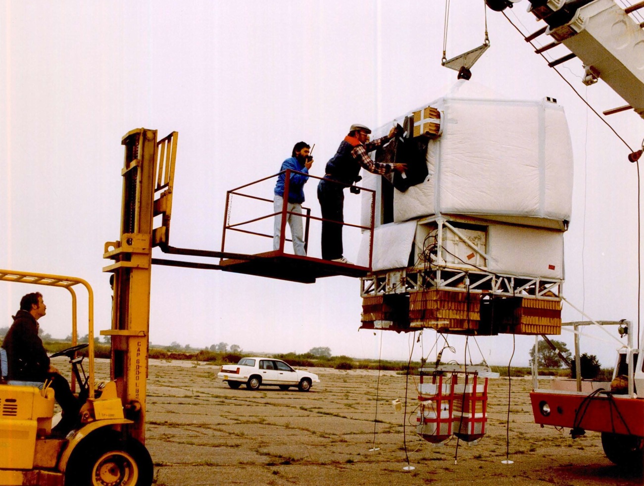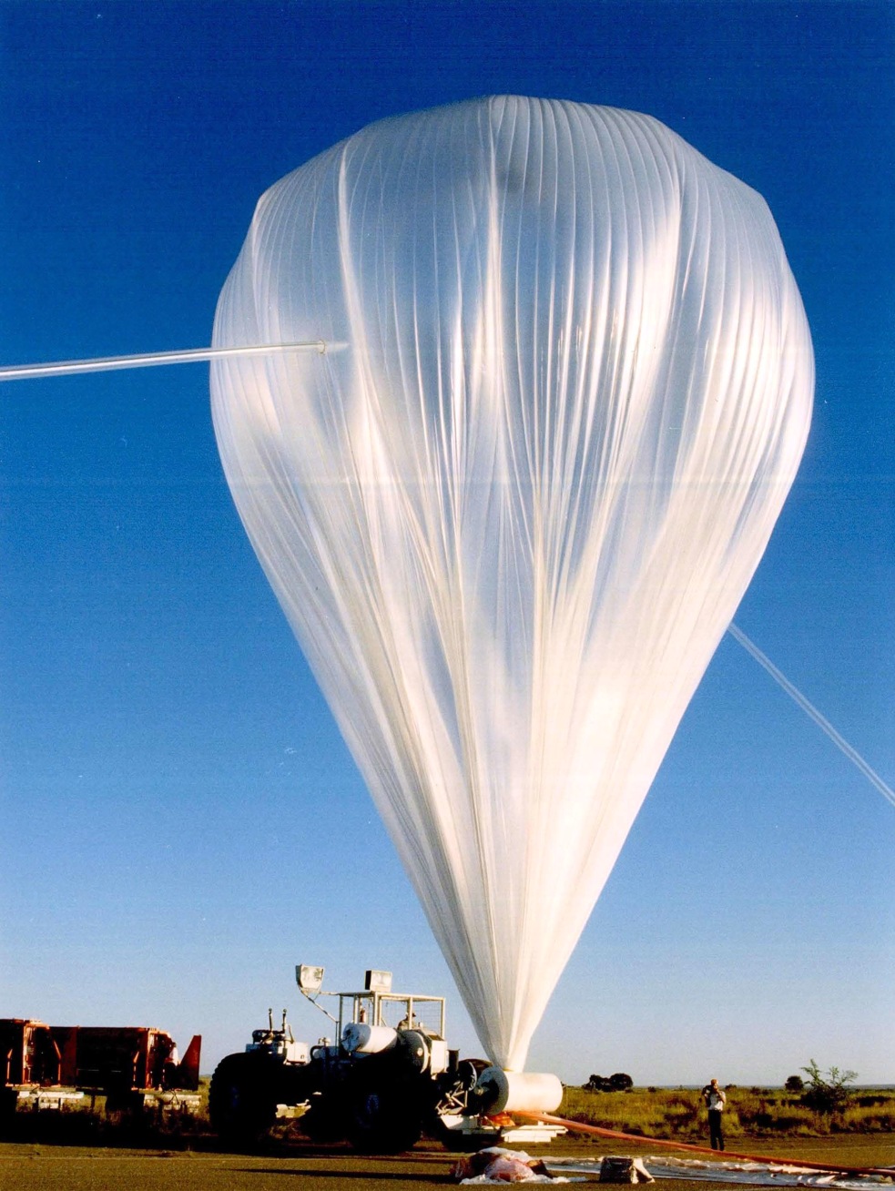 NSBF technician Scott Hadley, works the forklift to enable NASA engineer Dr. Ira Noft to remove the black protective cover from the IBEX instrument as Italian scientist Massimo Carlotti communicates the status of the instrument to the control tower IBEX balloon is filled with helium gas in preparation for launch (fill tubes on left and right). This volume of gas expands at high altitude to fully fill the balloon's volume of 30 million cubic feet IBEX ready to be launched