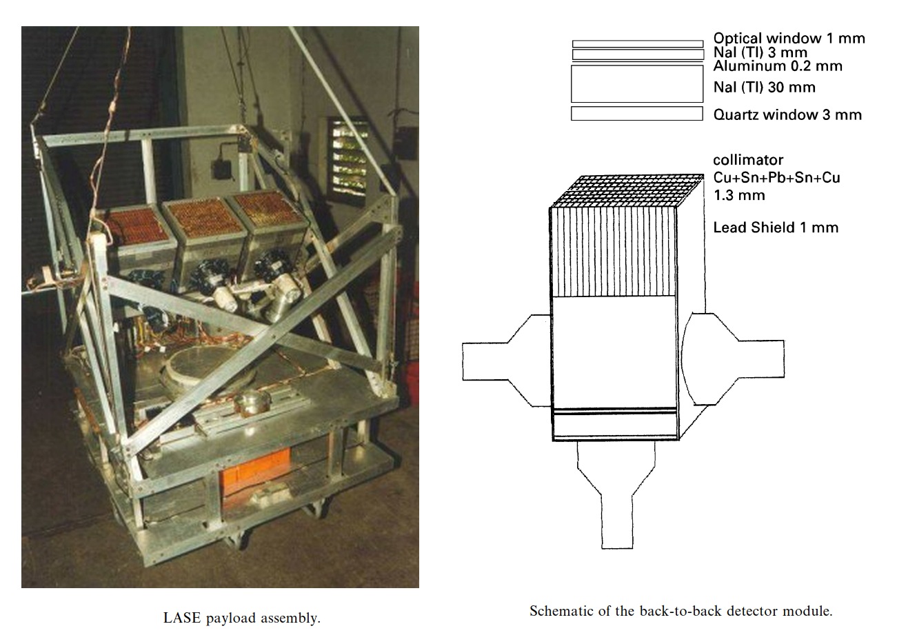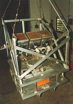 The X-ray gondola is shown in the figure at left and consists of the three detector telescope, payload electronics, PCM encoder, telecommunication package, X-ray source tracker and the orientation platform. The back-to-back geometry conceived for LASE consists of a combination of thin and thick sodium iodide detectors. Each of the detector modules has a geometrical area of 400 cm2 and consists of a 3 mm thick single crystal placed above a similar detector of 30 mm thickness and the two crystals are optically decoupled by a thin aluminum foil. An schematic diagram of the detector and the arrangement of the diffuse box with three phototubes attached to each module is shown clicking in the image at left.