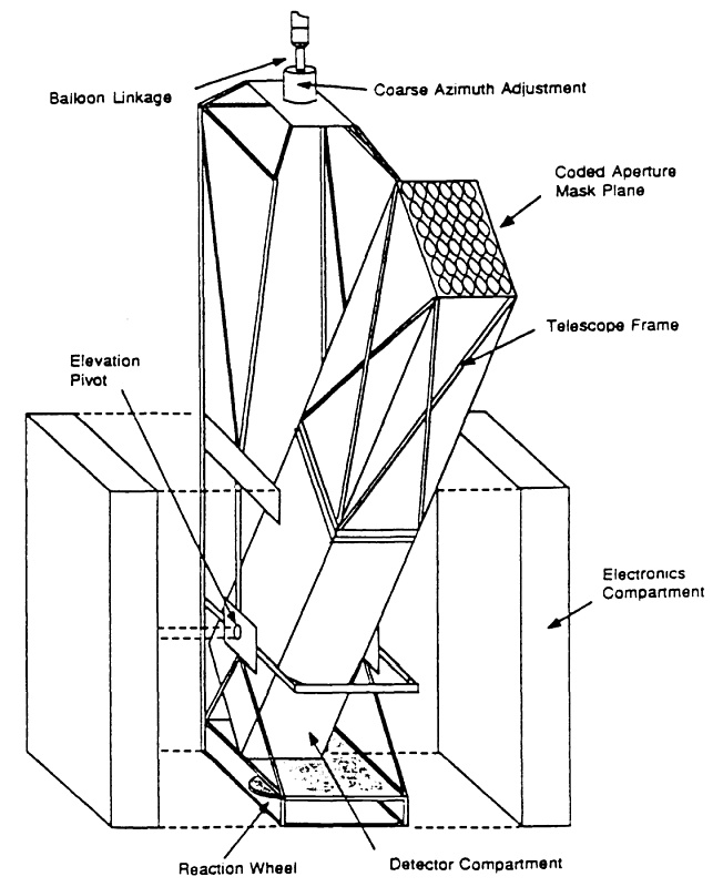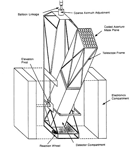 A schematic diagram of the telescope and gondola package appears at left. The major components of the telescope were the coded aperture mask plane, detector compartment, and telescope frame. The gondola frame -made of aluminum and measuring 1 meter square by 4 meters long- supported the telescope and electronics compartment as well as housed the reaction wheel, elevation drive, and coarse azimuth control.