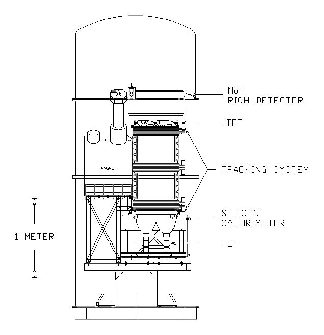 At left we can see an scheme of the instrument (click to enlarge). The apparatus included from top to bottom: a Ring Imaging Cherenkov (RICH) detector, a time-of-flight (TOF) system, a superconducting magnet spectrometer equipped with multiwire proportional chambers (MWPC) and drift chambers (DC) and a silicon-tungsten imaging calorimeter.