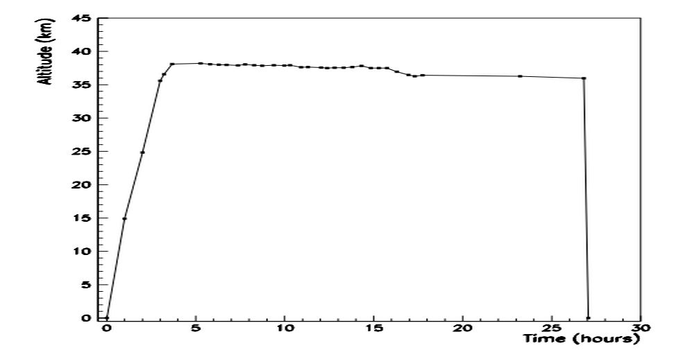 The CAPRICE experiment was launched from Lynn Lake Airport in Manitoba, Canada at 7.28 local time on the morning of August 8, 1994. After a nominal ascent phase it reached a float altitude about 38.2 km at 11:07. Once at float altitude, the balloon started to move in a westerly direction with a velocity of 10-18 m/s. The position of the payload was monitored during the whole flight by the NSBF using the Global Positional System (GPS). The GPS instrument gave information on the altitude as well as of the latitudinal and longitudinal position. The GPS data was used both to track the payload and to predict possible landing places. In the figure above can be seen the altitude curve as a function of time. The flight altitude dropped during the flight from 38.2 km to 36.3 km.