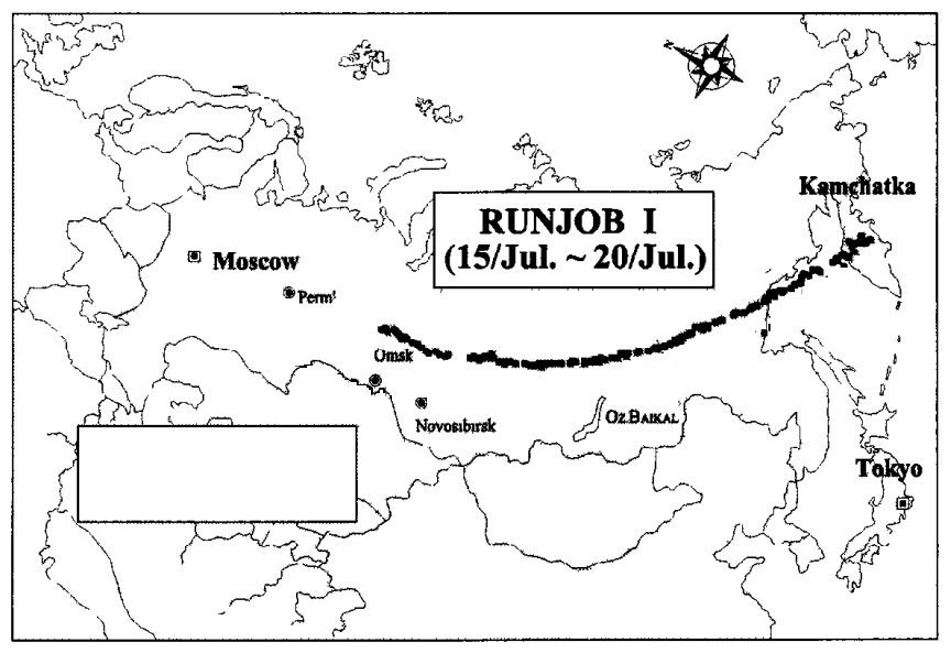 This was the first balloon mission of the RUNJOB program. The balloon was launched at 10:57 on July 15, 1995 from a site near Kliuchi in the Kamchatka Peninsula. It traveled westward during 130 hours at an altitude between 32.1 and 34.8 km. The payload landed in Markushiuno, Tyumen Oblast, Russia at 21:00 on July 20, 1995 and was later recovered by an helicopter.