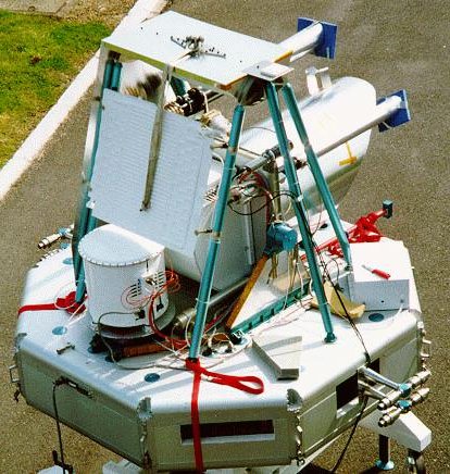 The azimuthal stabilisation was achieved by means of a cold gas system that used compressed nitrogen carried in pressurised tanks located below the gondola. During the flight, the gas passed through a buffer tank at an intermediate pressure whose flow was controlled very precisely by four proportional valves and let out through pairs of nozzles. There were two separate systems, the first one with high power thrusters for coarse control and the second one with low power thrusters for fine pointing.