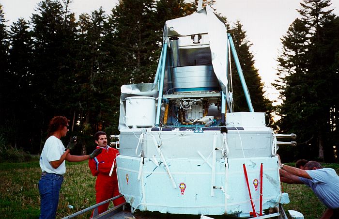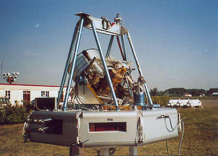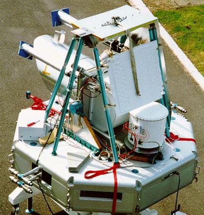 The platform base -see image at left- on which instruments and telescope were mounted was octagonal shaped. The entire gondola had a width of 3 meters and a height of 2.9 meters, weighting less than 500 kg. It's mechanical design was planned keeping in mind that it would be used repeated times in several flights so was developed to avoid damage to vital parts of the instruments at landing. Thus, the central telescope mount was located inside a lifting yoke which was in turn surrounded by an impact protection cage. Crush pads mounted below the gondola were also included in each flight to absorb the landing shock.