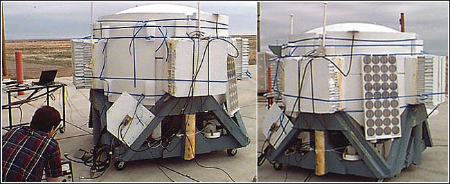 In the image at left, can be seen a scheme of the instrument (click to enlarge). SOFCAL included four vertically stacked chambers. The top chamber was a Cerenkov counter built with a Teflon radiator and photomultiplier tubes to measure the charge of incoming particles. Below this was an emulsion chamber divided into three sections: the primary section for charge identification, the target section to increase the likelihood of particle interactions, and an emulsion calorimeter that used x-ray films and emulsions to record electromagnetic cascades. Underneath this chamber was the Sci-Fi calorimeter, composed of multiple layers of lead interleaved with orthogonal layers of scintillating optical fibers, which captured detailed images of cascade development using image-intensified CCDs. The final chamber, another emulsion calorimeter, recorded high-energy cascades that penetrated the full depth of the instrument.