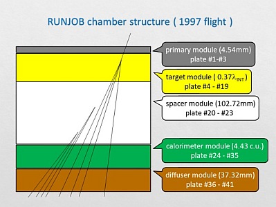 The project used for detection of the incoming cosmic rays emulsion chambers. At left we can see an scheme of the distribution of detector layers in the chamber of this particular flight.