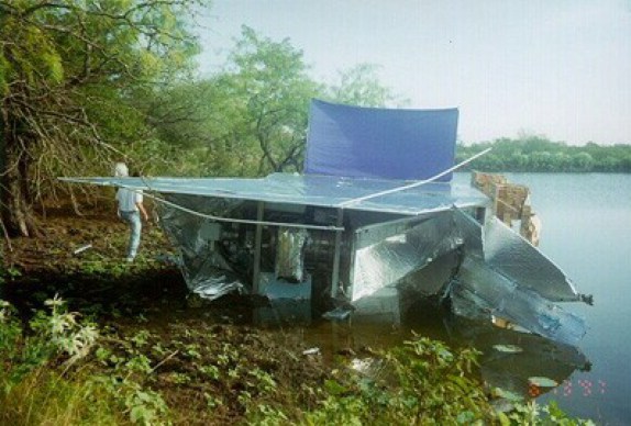 The BOOMERANG instrument before the launch hangs from the Tiny Tim launch vehicle After the earlier termination the instrument came to rest in a pond near the launch site.
