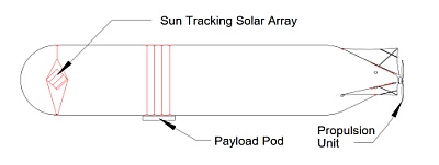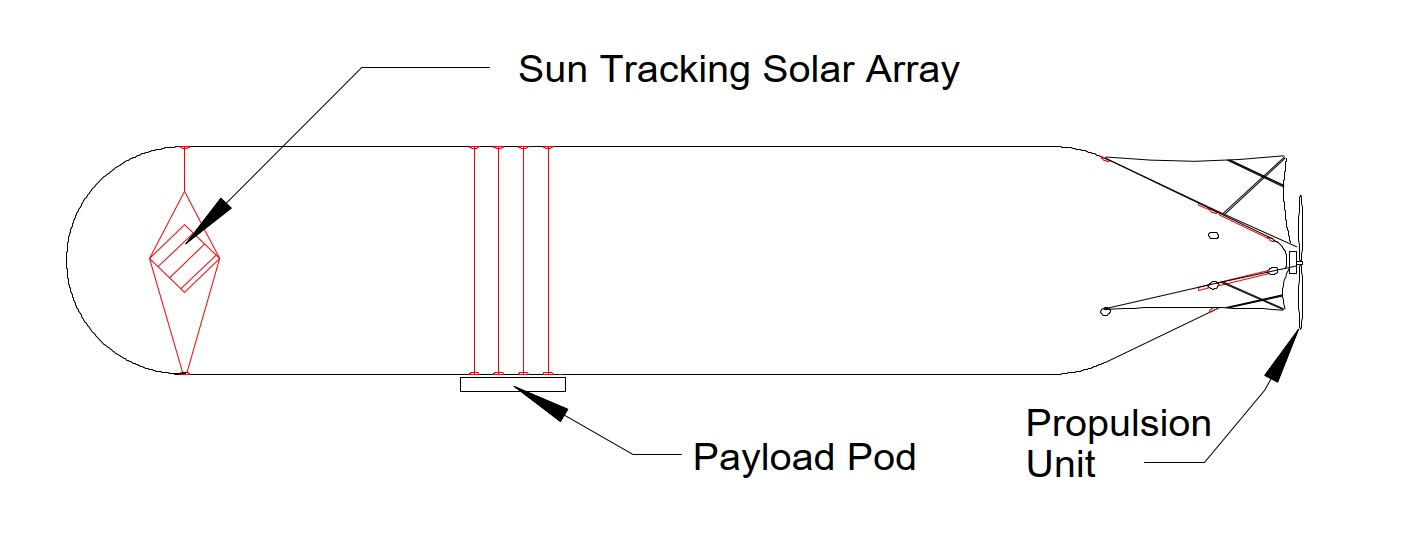 The propulsion system used a lightweight, tail-mounted, electric motor-driven propeller made of carbon fiber composite. A brushless electric motor drove a 3-meter-diameter propeller via a transmission, monitored by the control system for speed, voltage, and temperature. Power was provided by an internally mounted solar array on a two-axis gimbal, allowing it to track the sun independently of the airships orientation. This system powered the electronics and propulsion during the day and charged lithium-ion batteries for nighttime operation.
