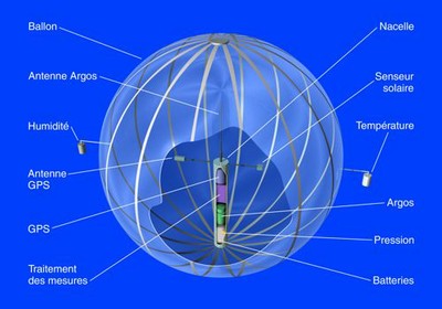 The balloons (image at left) were designed based on the ones used for the BALSAMINE experiment in 1979 with some improvements. They were made of non-extensible polyester with a diameter of 2.5 meters. A polystyrene container attached to the lower pole of the balloon housed all the electronic equipment, including power supply (lithium cells), an ARGOS satellite locator, the transmitter-oscillator, data encoder, and a pressure transducer to measure the pressure inside the envelope. Detaching from that container inside the enevelope, were added two arms holding a Solar Collector and a GPS antenna, while in top of it was placed the Argos antenna. The ambient temperature and humidity sensors, were located hanging at the end of two external arms fastened at the equator of the balloons envelope.