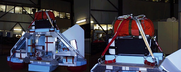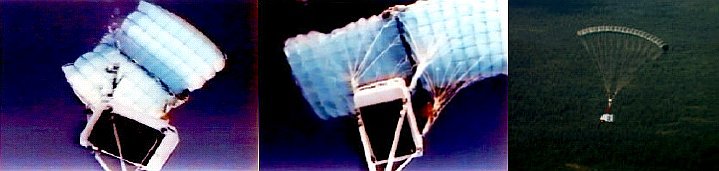 View of the ORION's system test (the parachute is in the red bag) Parachte deployment sequence just after the gondola release Controlled flight and land approach sequence.