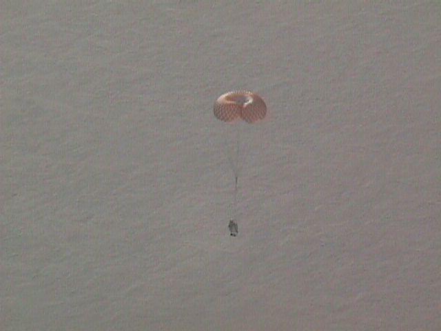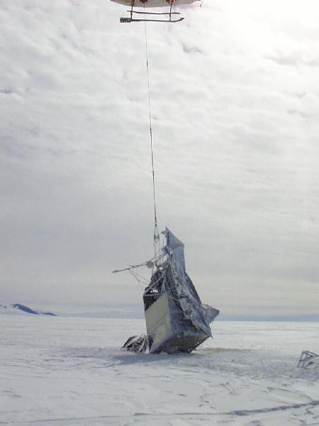 The same day the recovery crew traveled in helicopter to the landing site and readied the payload for its trip back to the base.