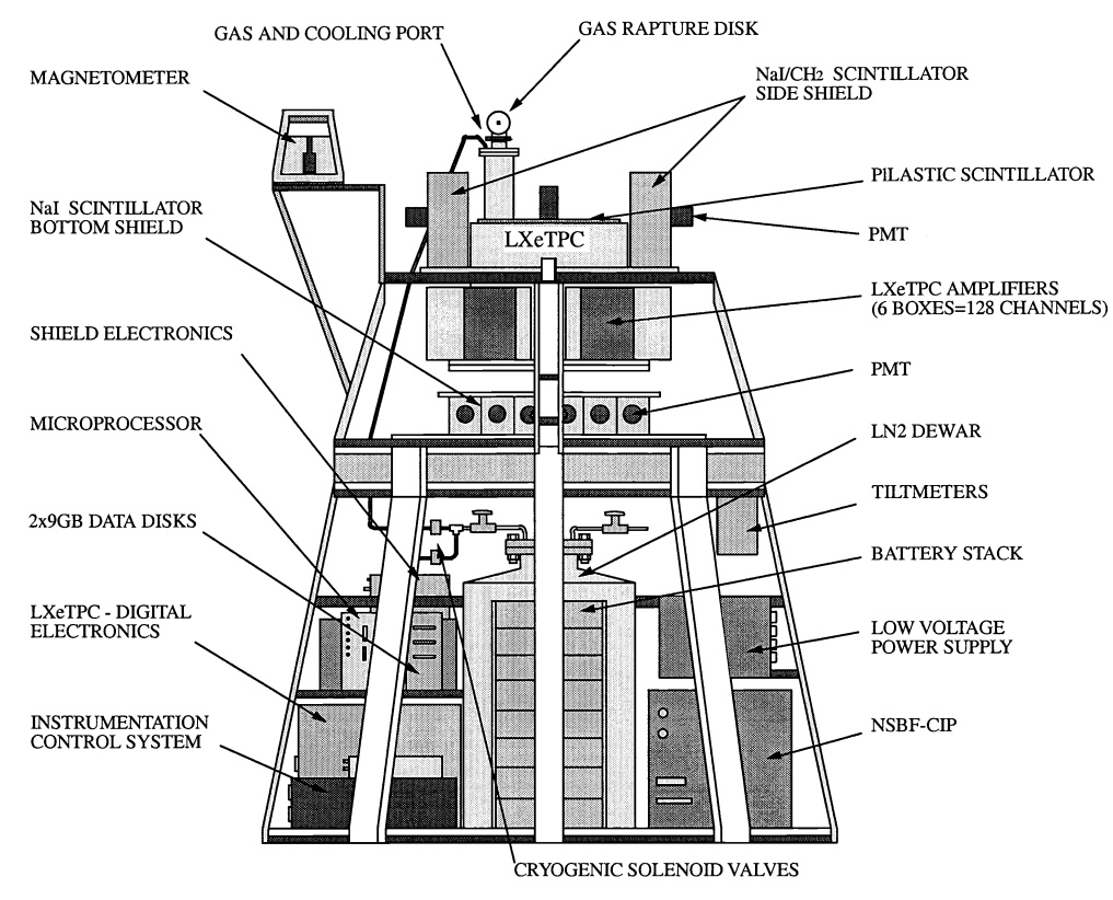 The LXeTPC and its associated electronics were enclosed in a vacuum-insulated cryostat to reduce heat transfer and maintain the liquid xenon at its operating temperature of -95°C. The gondola carried a liquid nitrogen (LN2) dewar, modified to include a molecular sieve trap for maintaining vacuum conditions. This dewar supplied LN2 to cool the xenon, with solenoid valves controlled by the Instrumentation and Control System (ICS) ensuring precise temperature regulation. The gondola's thermal design also mitigated risks of overheating in reduced-pressure environments at high altitudes.