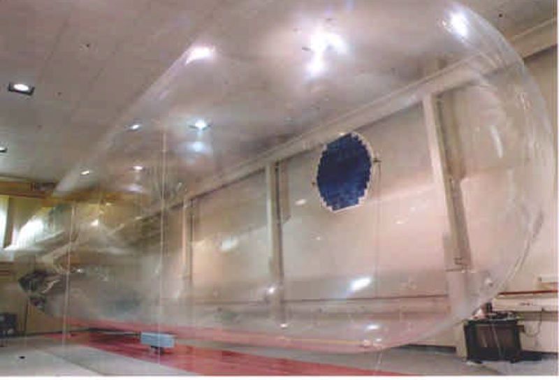 Indoor test inflation of sounder Sounder's prelaunch activities at the Hondo airport, Texas On-board camera view from inside the hull of Sounder looking toward the tail.  Balloon was at 22 km altitude at this point.