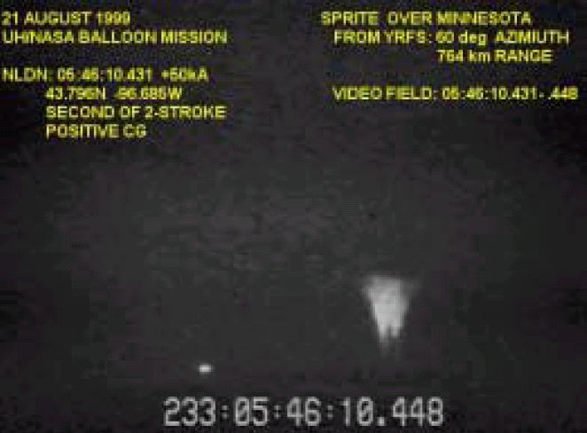 View of the launch pad before the start of the flight Reproduction of one SPRITE detected from the balloon during the flight. The luminous phenomena was produced over a storm located in Minnesota