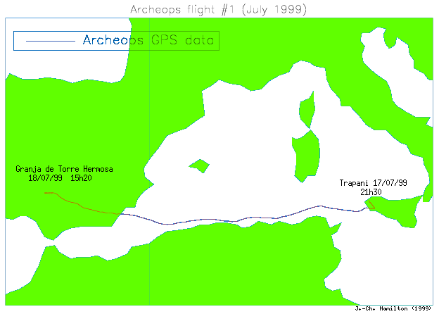 The balloon trajectory was nominal for a trans-Mediterranean flight. After take-off from Trapani (Sicily) the balloon achieved float altitude at 1:27 maintaining during the rest of the flight a height of flight of between 40 and 42 kms and grazing the African continent before reaching Spain.